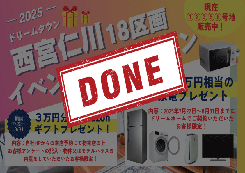 2025年7月22日~8/31日までにドリームホームで西宮仁川の物件をご契約していただいた方限定に100万円相当の家電をプレゼントいたします!