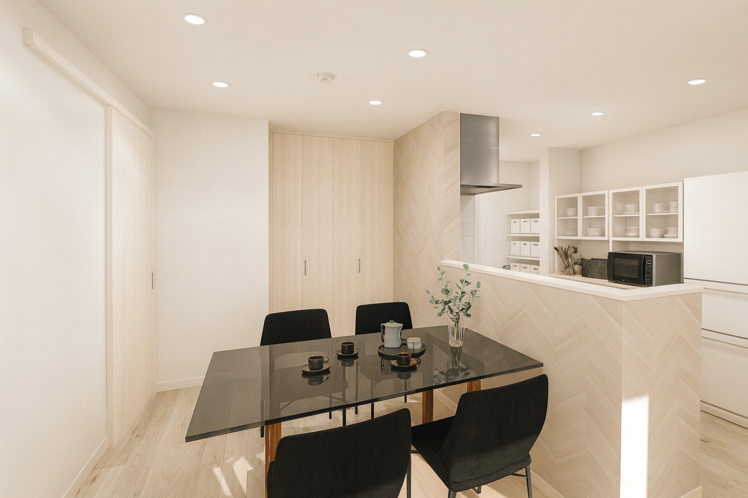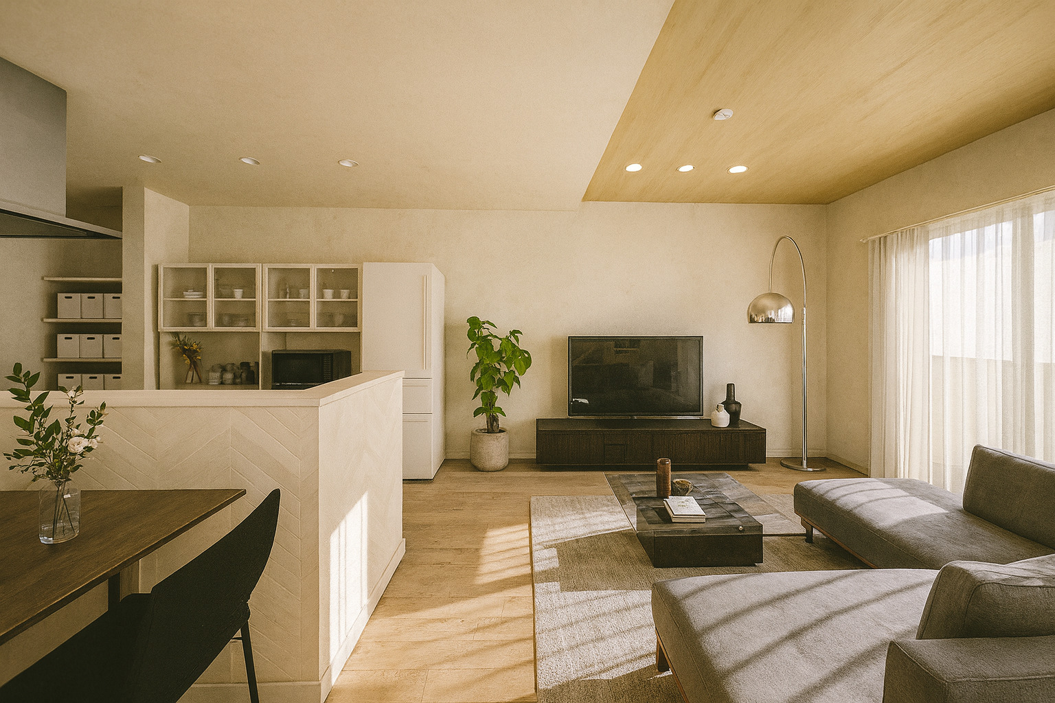 ダイニングとリビングを天井クロスで張り分けメリハリのある空間に!