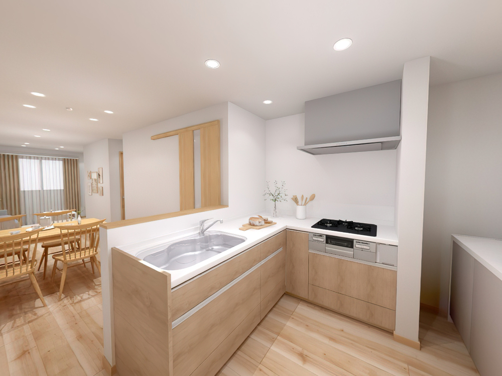 ■L字型キッチンはシンク・コンロ・作業スペースが効率よく配置され無駄な動きを減らすことができます。収納力にも優れ、使いやすさとデザイン性を兼ね備えたキッチンです。