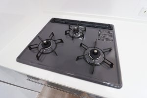 バーナー間隔が広いので、3口同時に使っても鍋振りもできます。グリルの排気口をコンパクトにして、仮置きできるスペースもご用意しております。