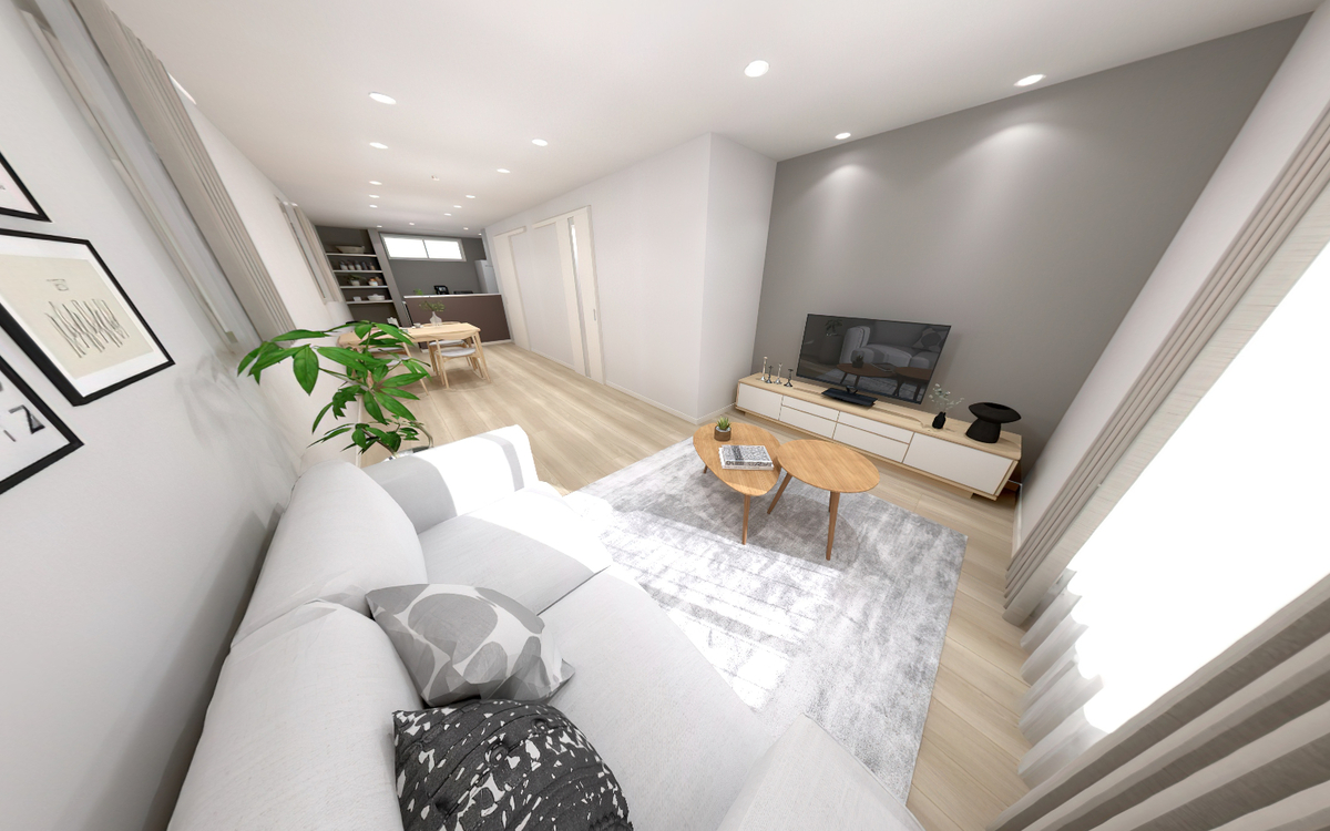 ■20帖の広々としたリビングは、家族みんなが集まってもゆとりのある快適な空間です。ソファやダイニングを置いても圧迫感がなく、開放的に過ごすことができます。(イメージパース)