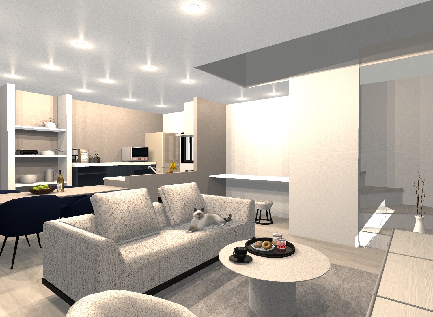 リビングを通って2階へ上がるリビングイン階段は、家族が自然と顔を合わせる動線設計。