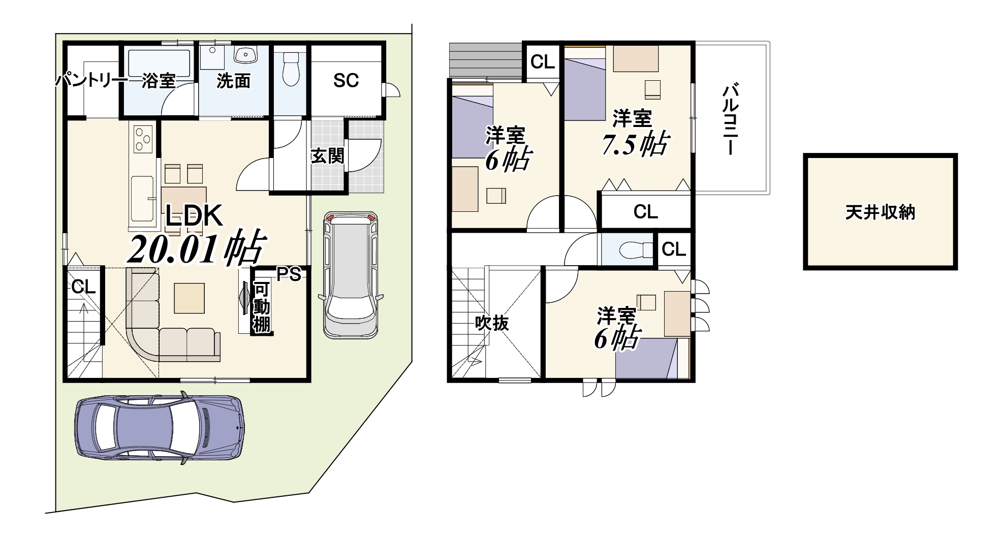 • 間取り内訳 LDK:20.01帖 洋室:6帖×2  7.5帖