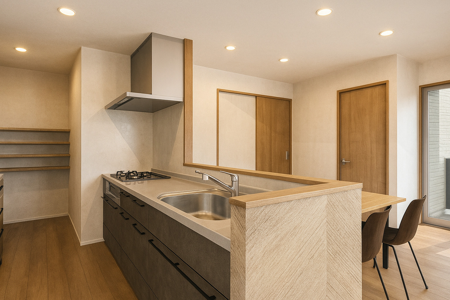 キッチンには便利なパントリー付きです。週末のまとめ買いもスッキリ収納できます。