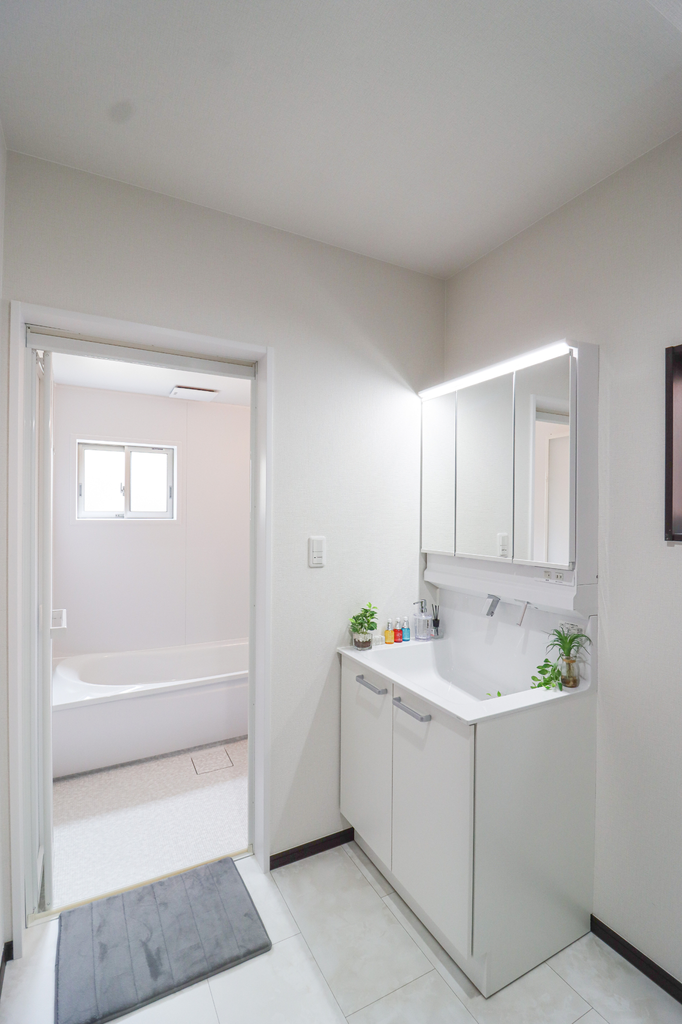 ミラーキャビネットになっており、メイク用品や洗顔小物をスッキリ収納できます!来客時にも安心の収納力です。